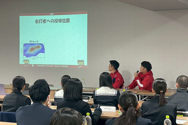 データ分析の部門では、カープ球団でアナリストを務める飯田 哲矢と一岡 竜司が講師を務め、ストライク率や投手育成に重要な統計の見方、高度な分析機械のない高校でも取り組める方法などを紹介いたしました。