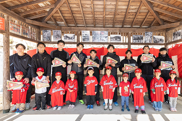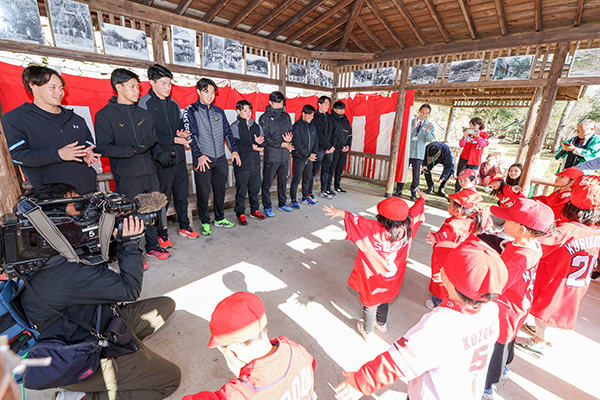 参拝後には地元湯来保育園の園児から新入団選手へ激励のCCダンスが披露され、CCダンス終了後には園児の皆さんから、新入団選手へプレゼントが贈られました。