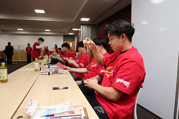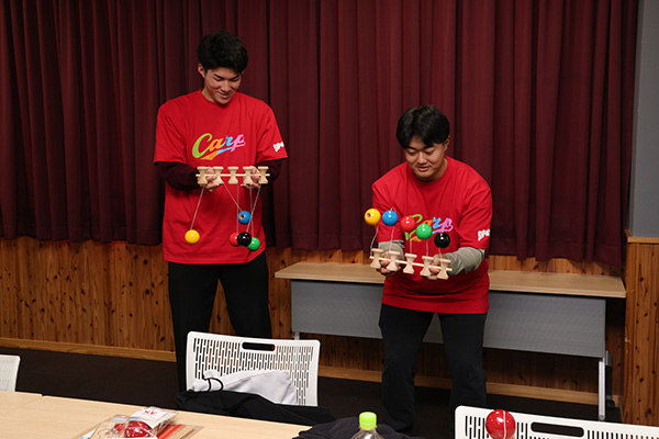 住民票の手続きの待機時間では、廿日市市職員による「けん玉講座」も行われ、選手たちも技の習得に励み、次々と技を披露してくれました!